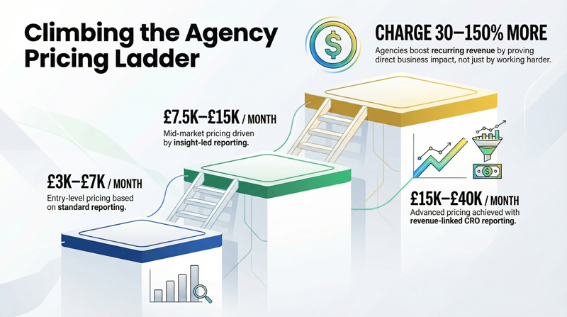 Agencies command higher pricing not because they work harder, but because they prove business impact. CRO reporting allows agencies to charge 30–150% more, boosting Monthly Recurring Revenue (MRR).
