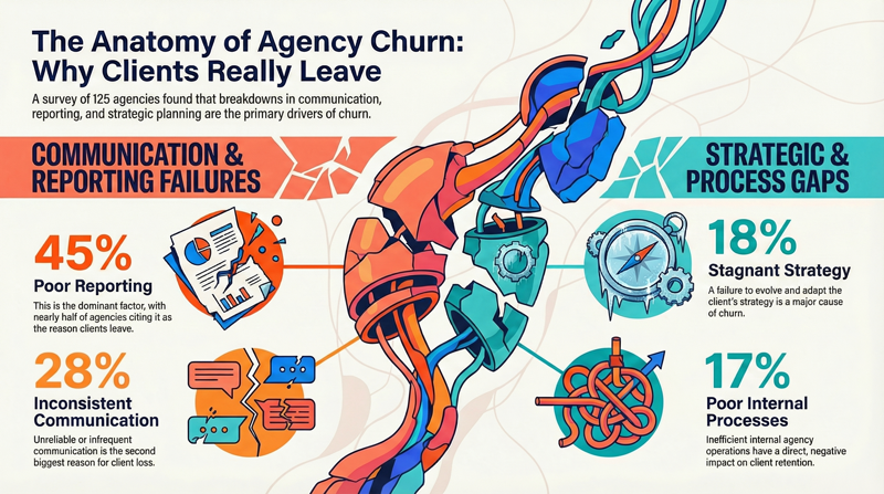 In a recent qualitative and quantitative study of 125 marketing, web, SEO, and performance agencies, we identified the primary blockers to retention. We asked agency owners and account managers: “Why did your last client leave?”